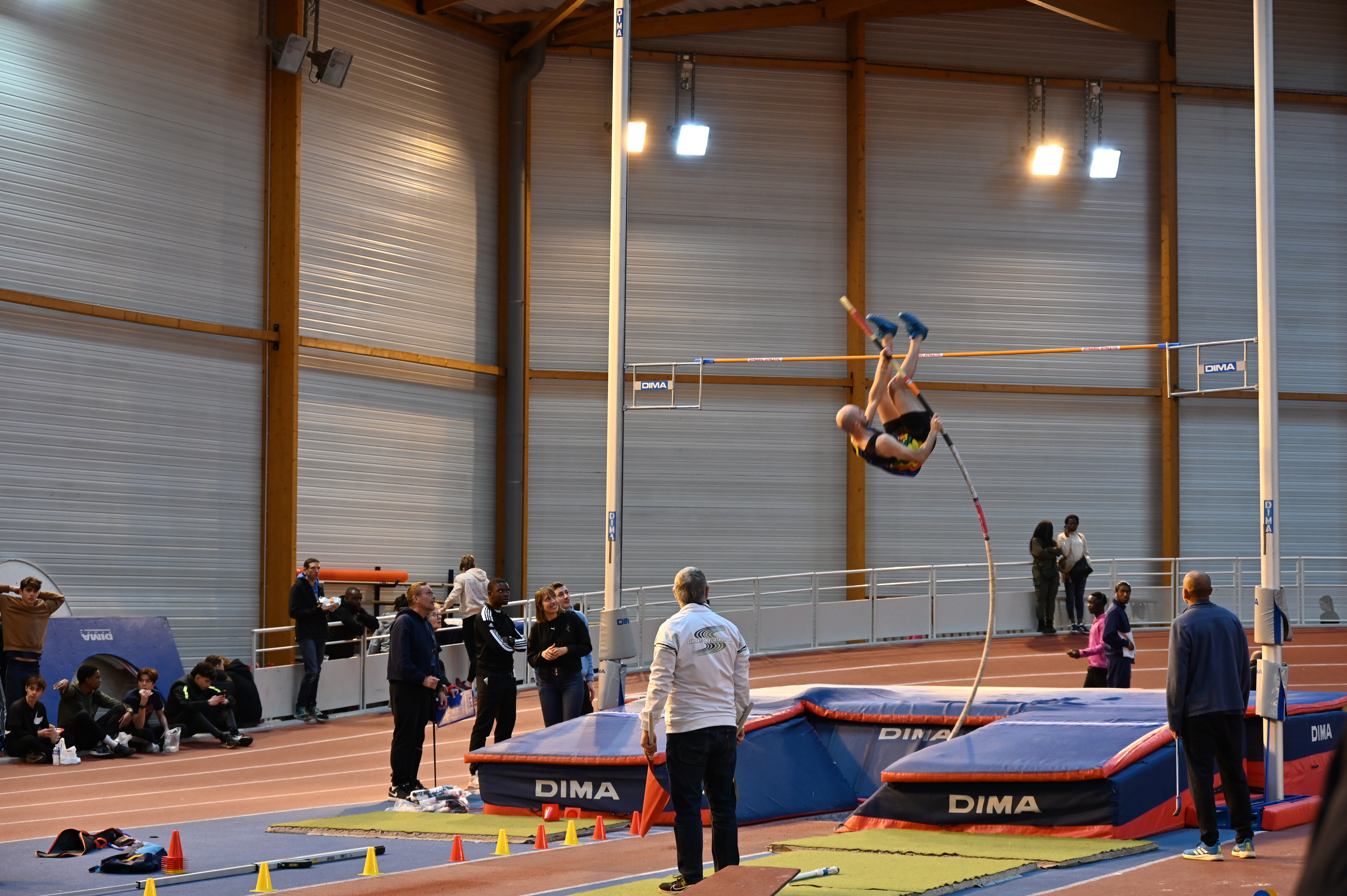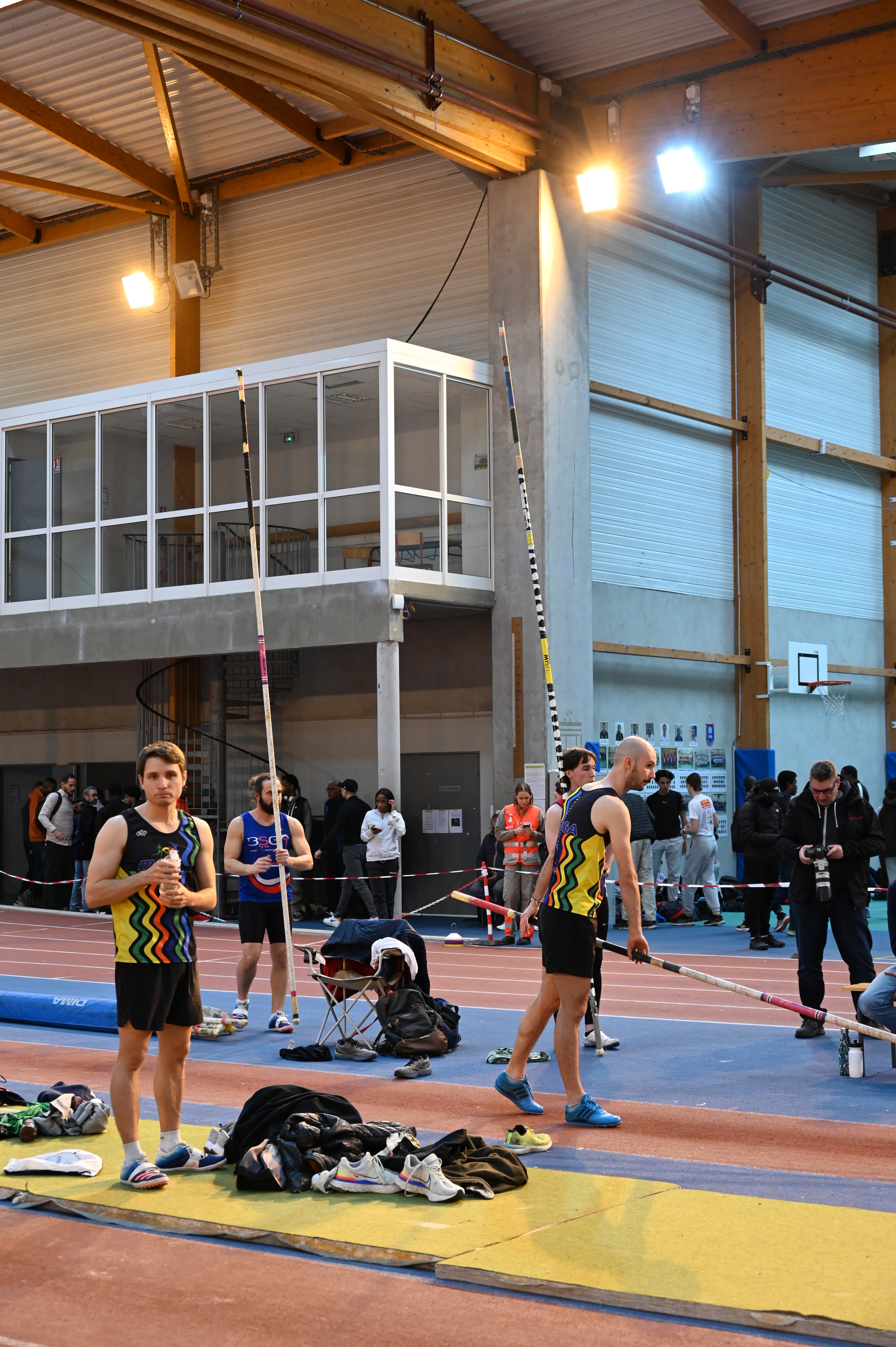 La compétition commence à 10h30 avec le concours de perche ( 30 athlètes) Adrien et Geoffroy commençant le concours avec des barres plutôt hautes ne débuteront pas avant 13h. En parallèle de la perche Adrien court le 60 haies une course de qualif en 10.12 qui lui ouvre les portes de la finale, une finale couru également en 10.12 qui lui vaut la première place.