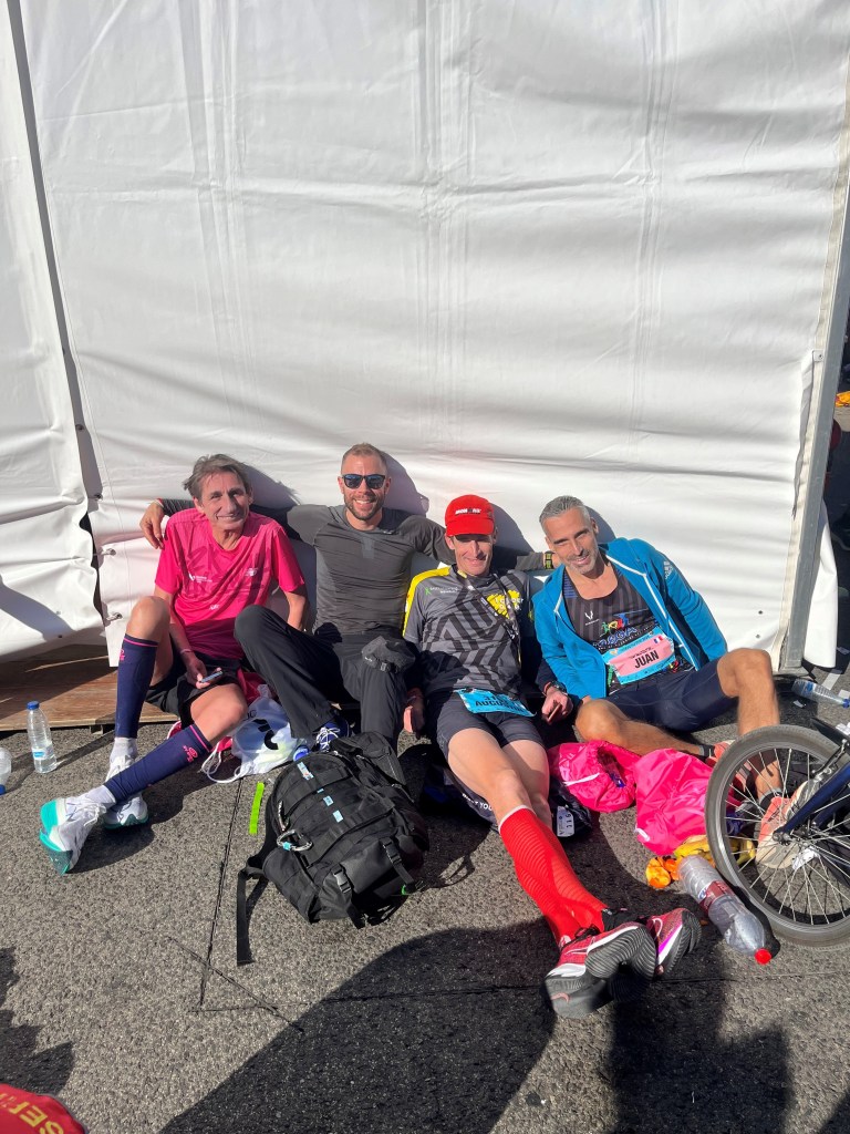 4 personnes de notre groupe route, entraînés par Jacky, avaient répondu présent: Christine Wortham (6ème de sa catégorie en 3h31), Thierry Pappalardo (2h57), Juan de Oliveira (2h53) et ma pomme (Augustin de Préville, 2h52). Le tout sous les encouragements nourris de David Petit qui accompagnait à vélo (blessé, il n’avait pas pu prendre part à la course).