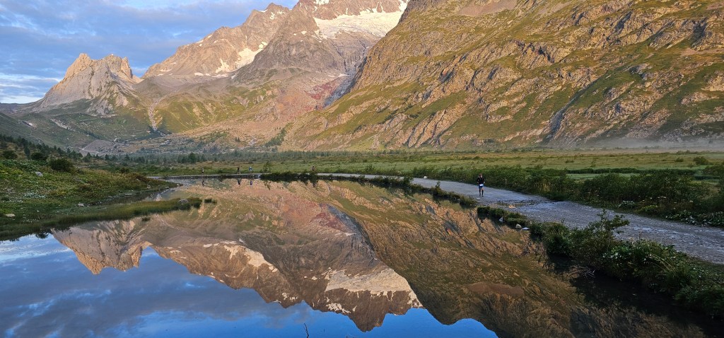 Passé ce moment de grâce le jour se lève enfin alors que j’atteins le ravitaillement du Lac Combal (KM 69 / SAM 06:50:45 / 12:45:53 de course / 1 124°) dans un décor d’une beauté inouïe, magnifié
