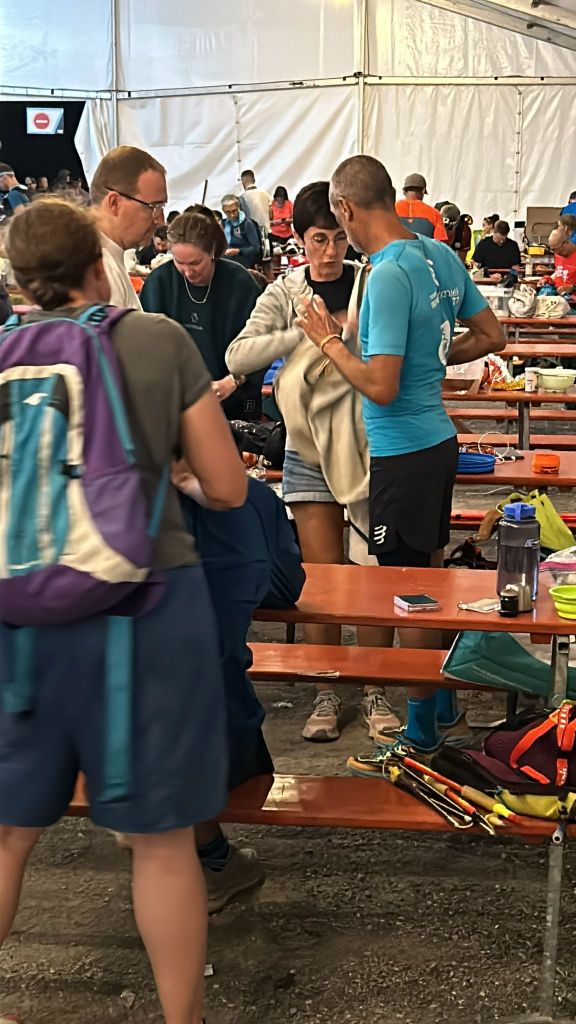Juste avant le ravitaillement j’aperçois mon ami Jérôme (Finisher UTMB l’année précédente) qui est venu à ma rencontre m’apporter son soutien. Revoir un visage ami et bienveillant, après ces heures de solitude à broyer du noir, me fait un bien fou. Il trouve les mots justes, me donne les conseils avisés et me galvanise. Merci Jérôme !