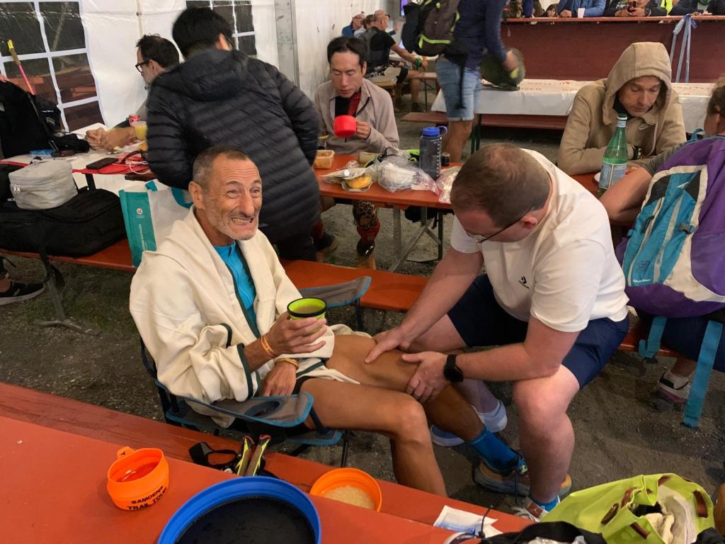 m’alimenter depuis le départ mais mon estomac me joue néanmoins des tours. Je vomi même un peu avant d’arriver au Lac Combal. Je décide donc de m’y arrêter plus longtemps que prévu. J’y mange doucement un bouillon accompagné de riz qui me revigore, et je repars vers Courmayeur, ravit aliment stratégique où mes suiveurs m’attendent. Parc des Sports de Courmayeur (KM 83 / SAM 09:33:17 / 15:28:25 de course / 1 099°). J’y reste une heure pendant laquelle je dors 15 mn, mange des pâtes et de la pizza – nous sommes en Italie ! – et me change entièrement. À la sortie Lilly fait encore carillonner sa cloche pour mon plus grand plaisir !